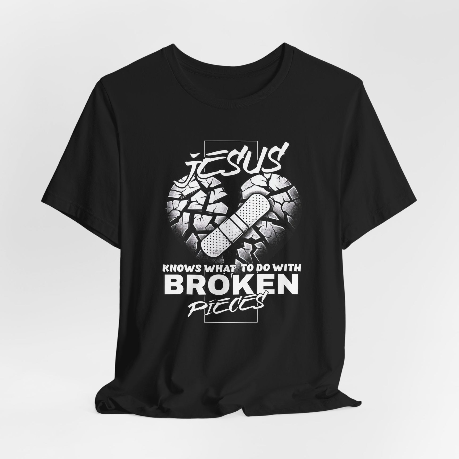 Christian t-shirt with a powerful message, 'Jesus knows what to do with Broken Pieces,' serving as a reminder of Jesus as our Savior and Redeemer. Perfect for those seeking faith-based apparel for everyday wear or to express their beliefs. Ideal for Christians celebrating Easter, Christmas, or church events.